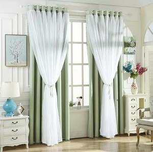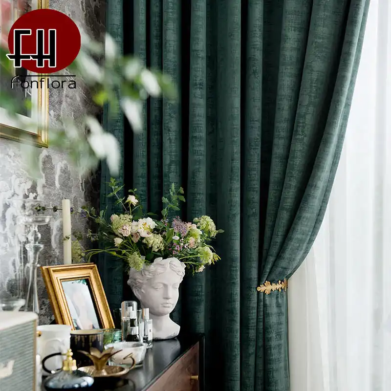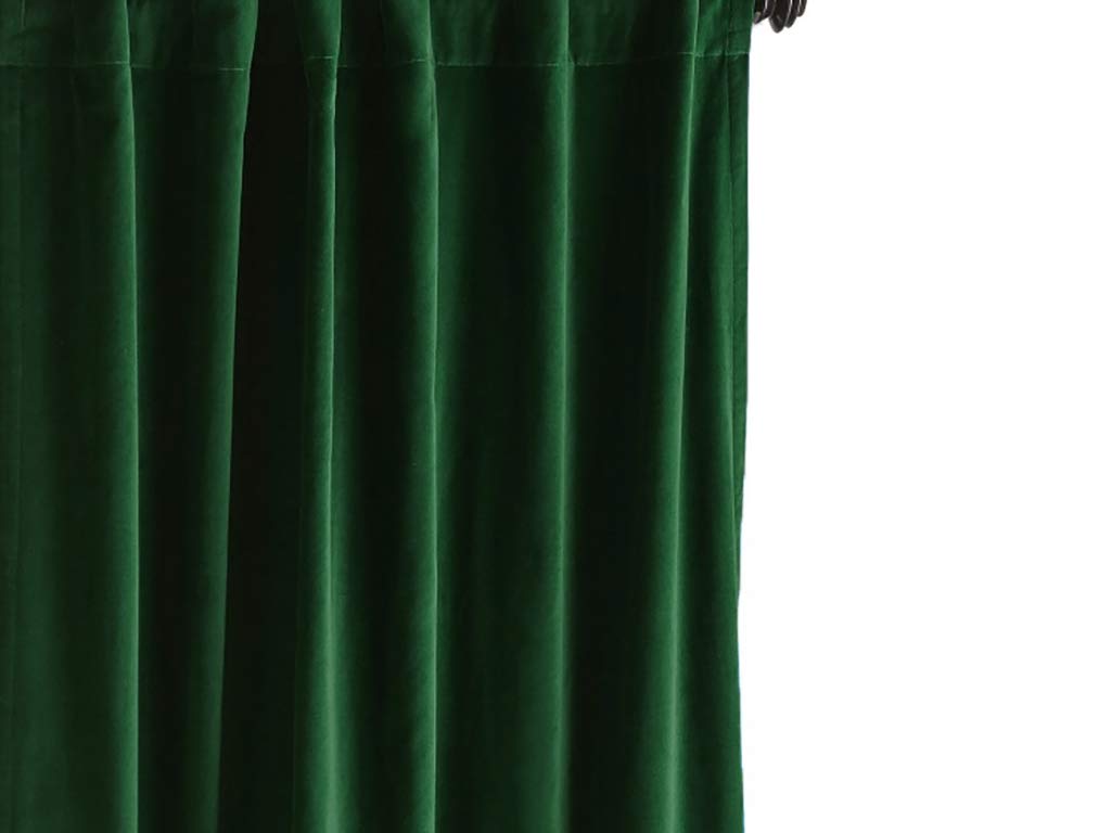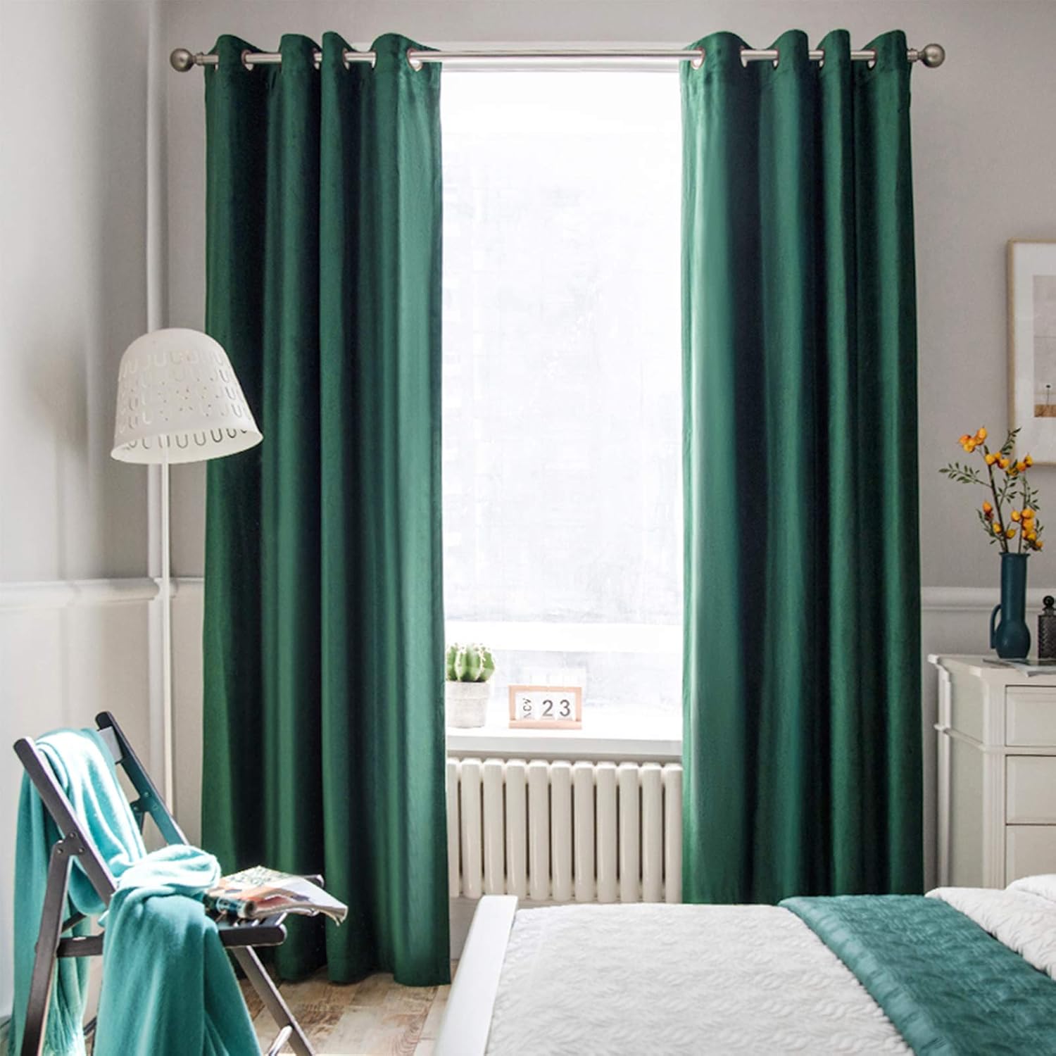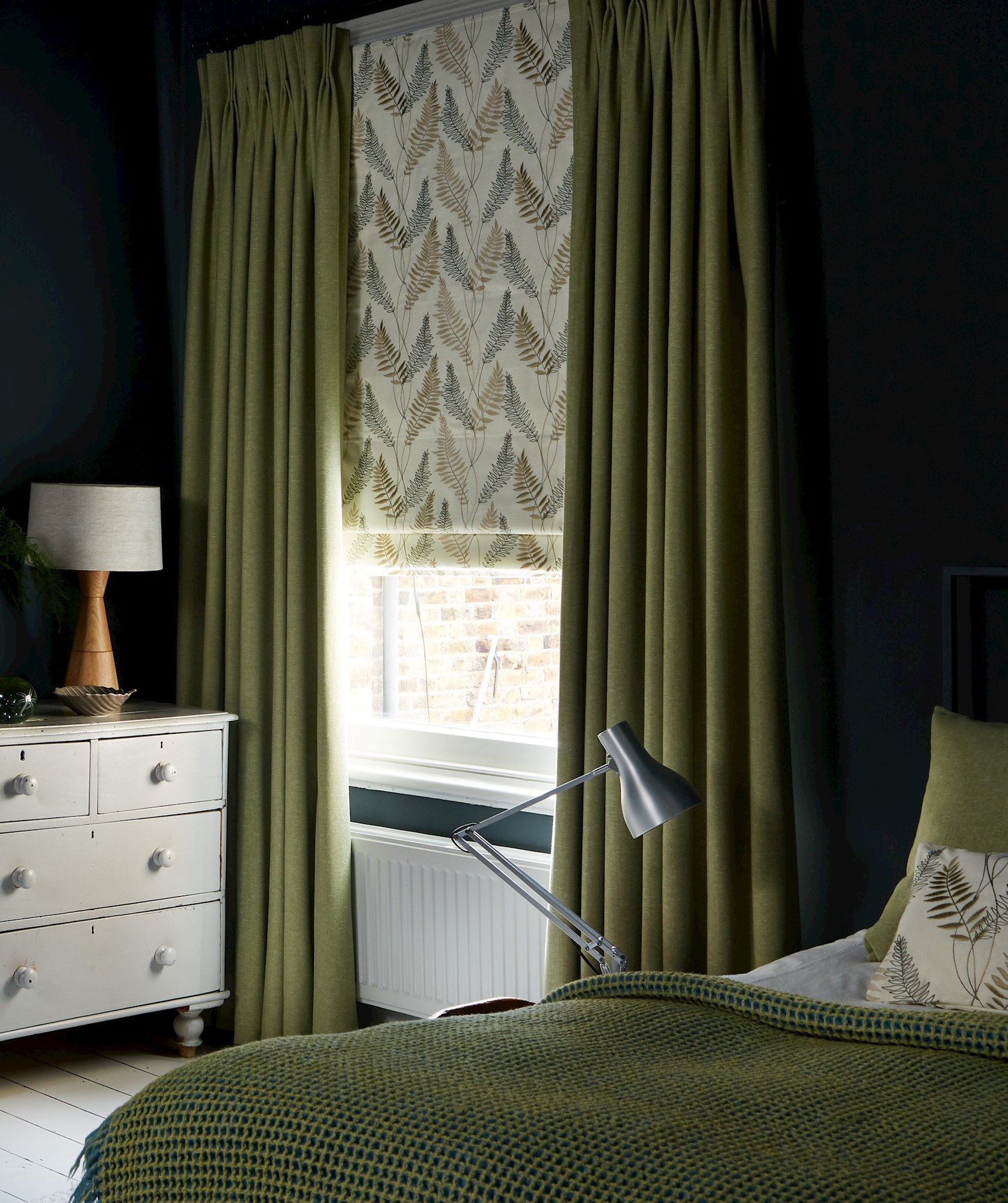 bedroom with green curtains