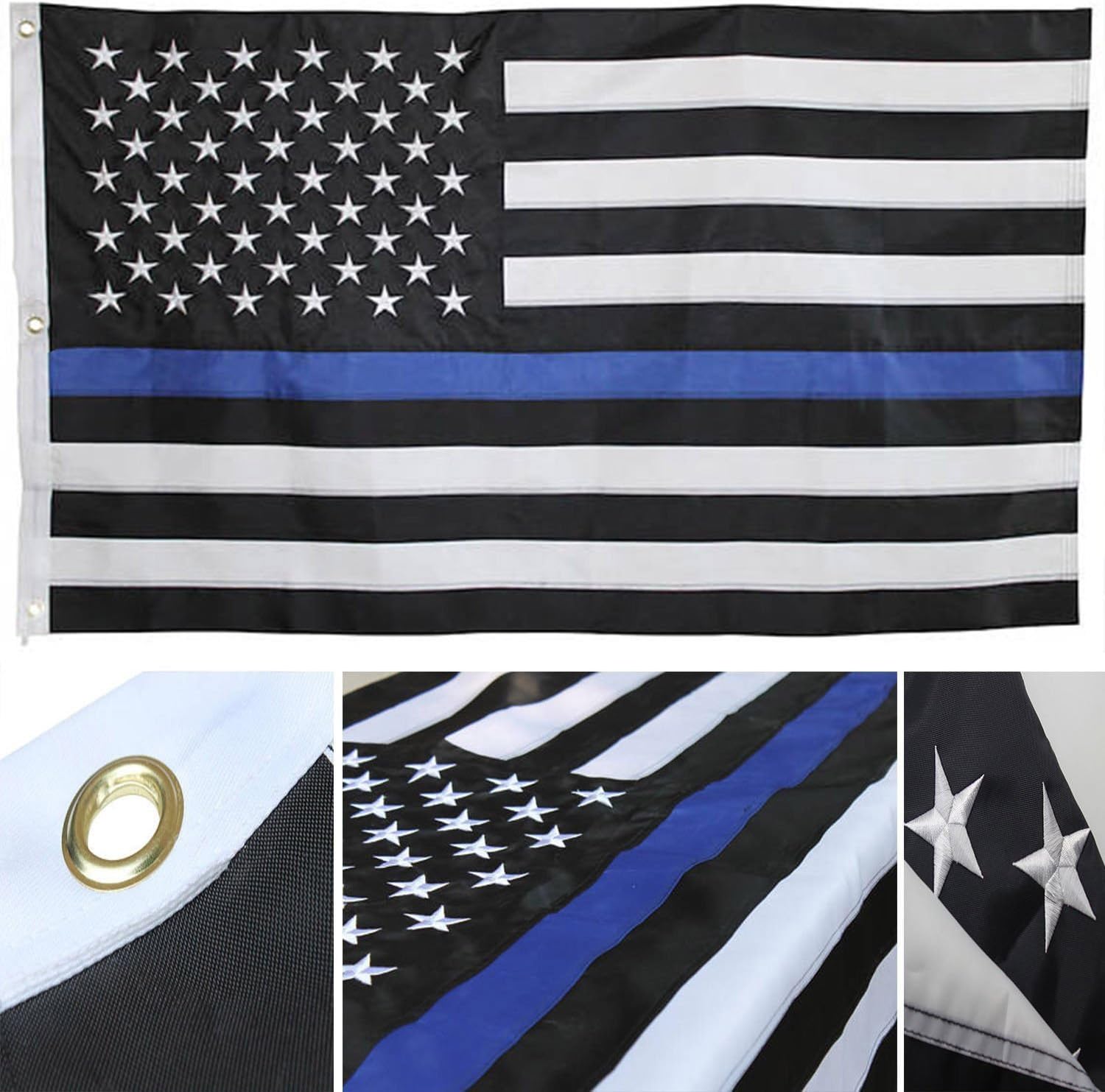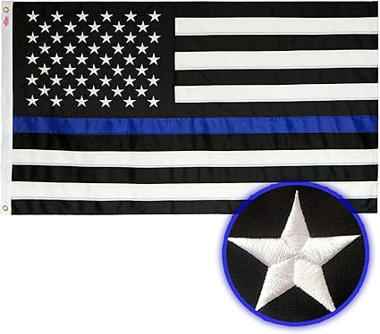 black and white flag with blue stripe