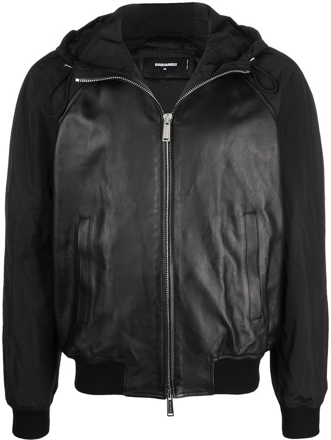 black leather jacket with hood