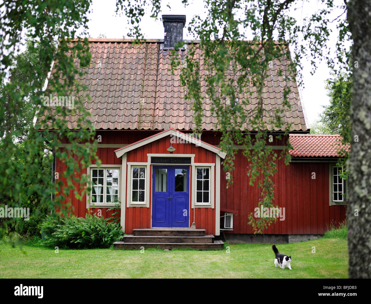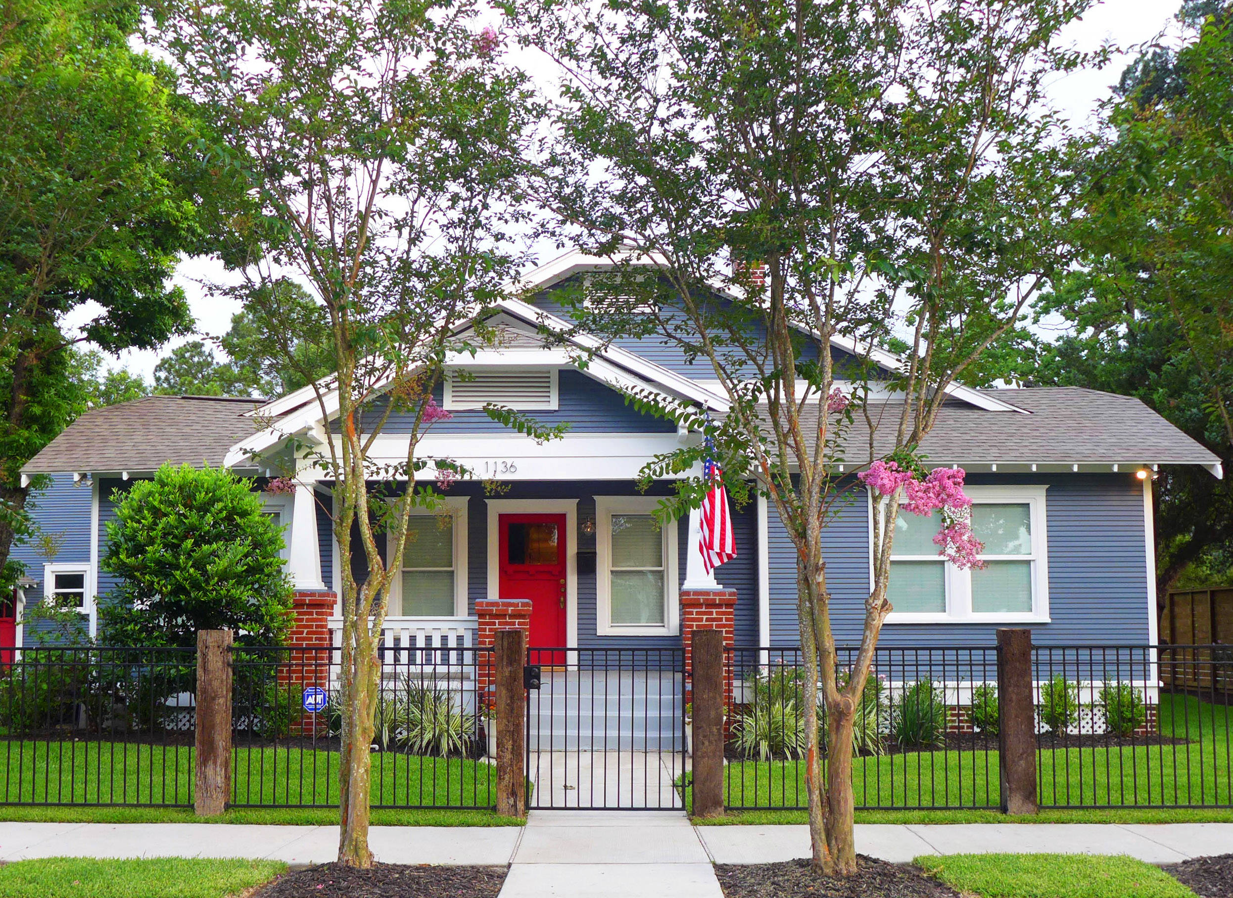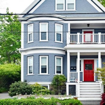 blue houses with red doors