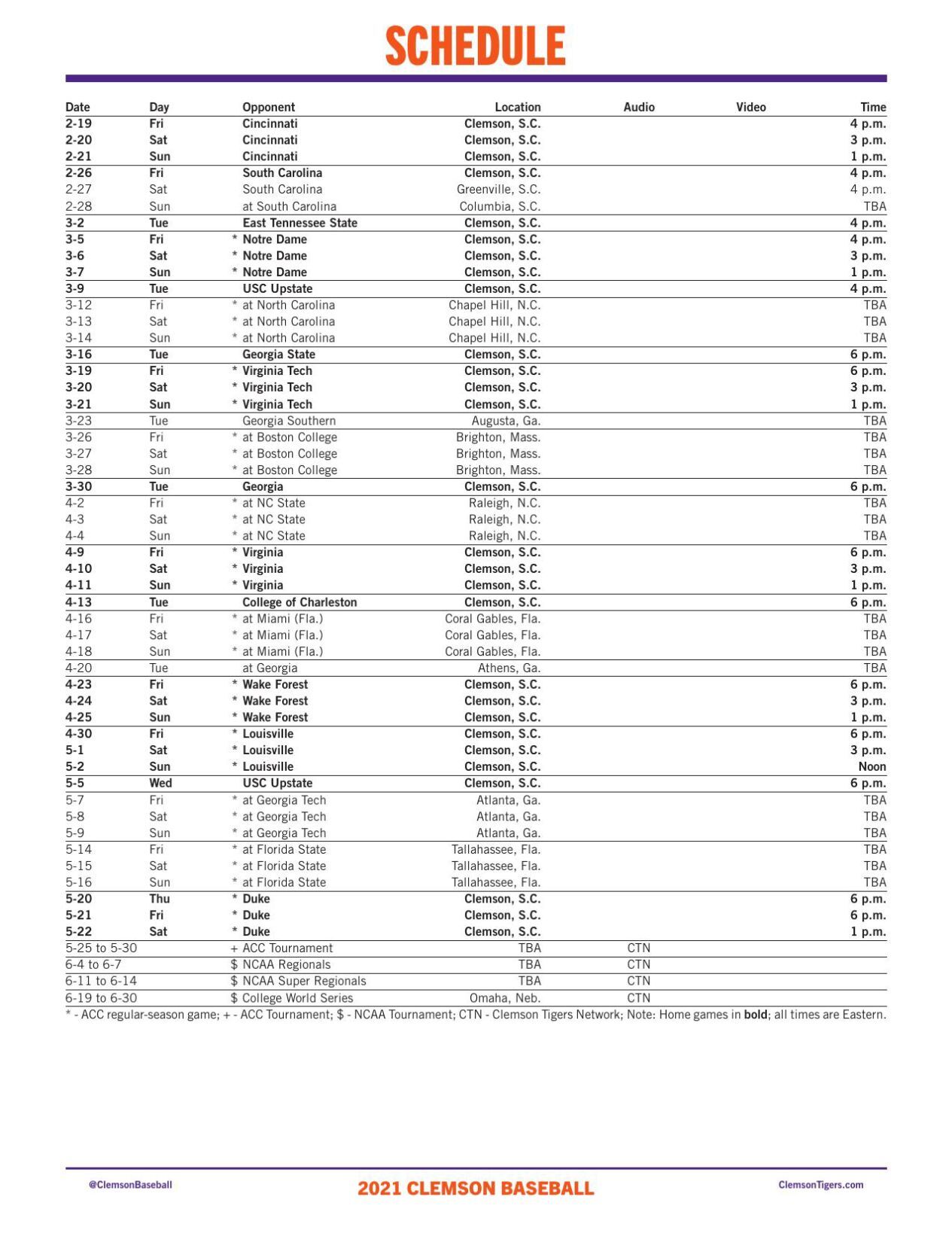clemson baseball schedule