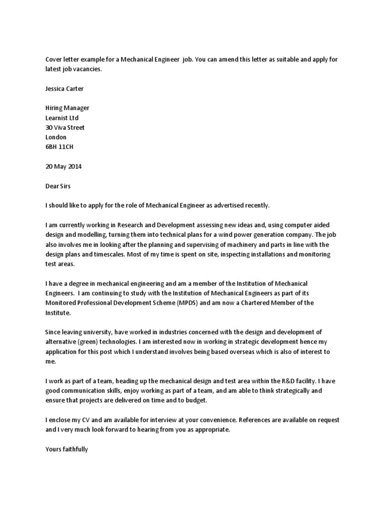 cover letter for mechanical engineer