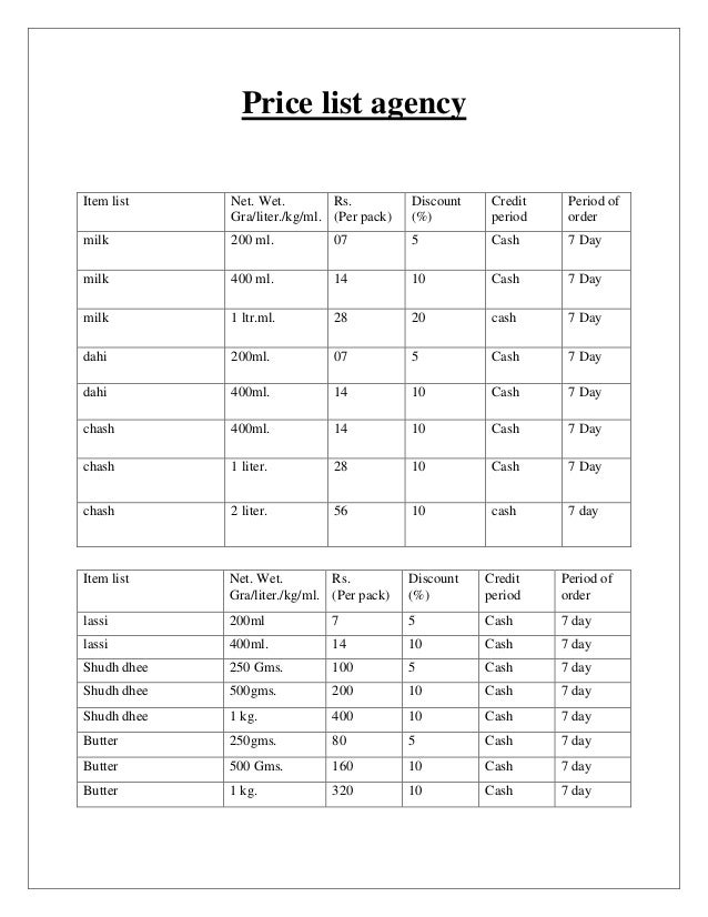 dairy milk price list