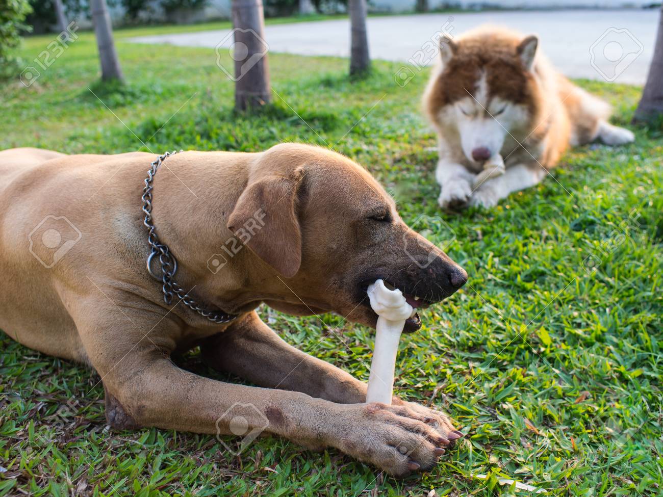 dogs eating bone