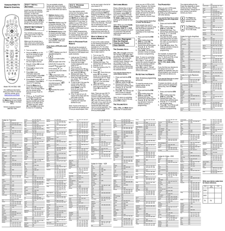 fios remote codes
