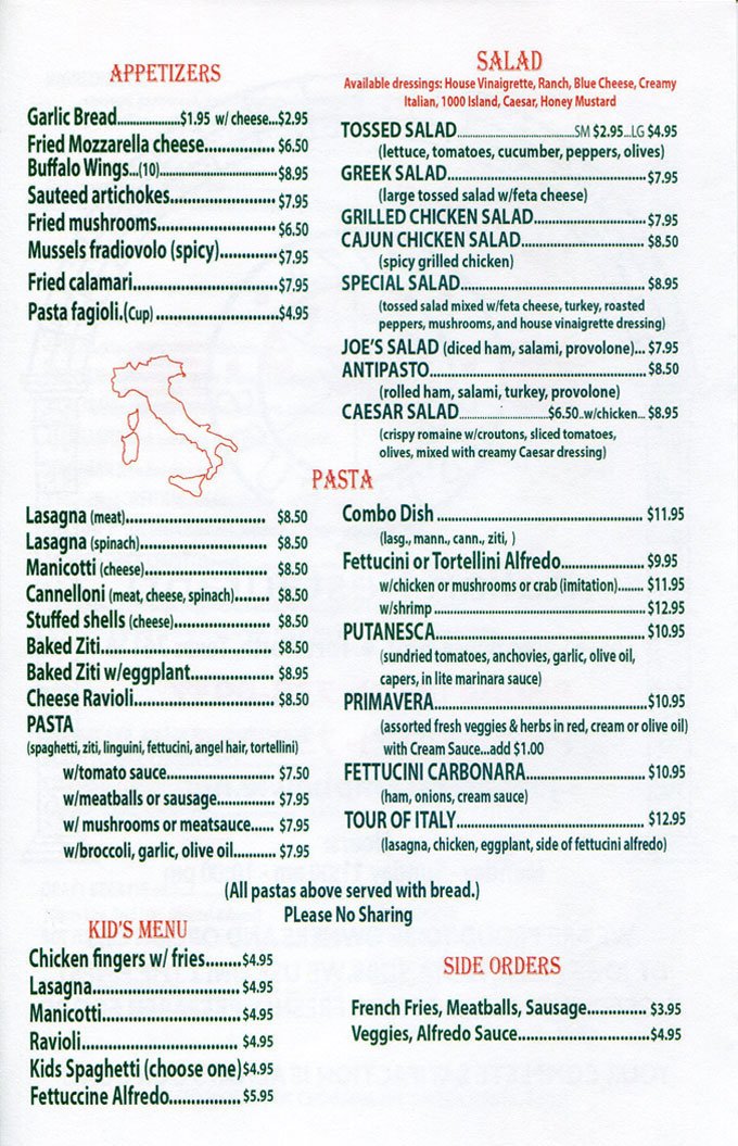 joe's pasta and pizza menu