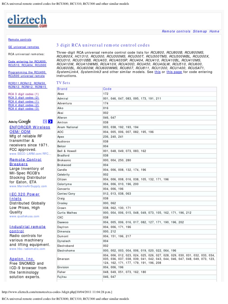 rca codes