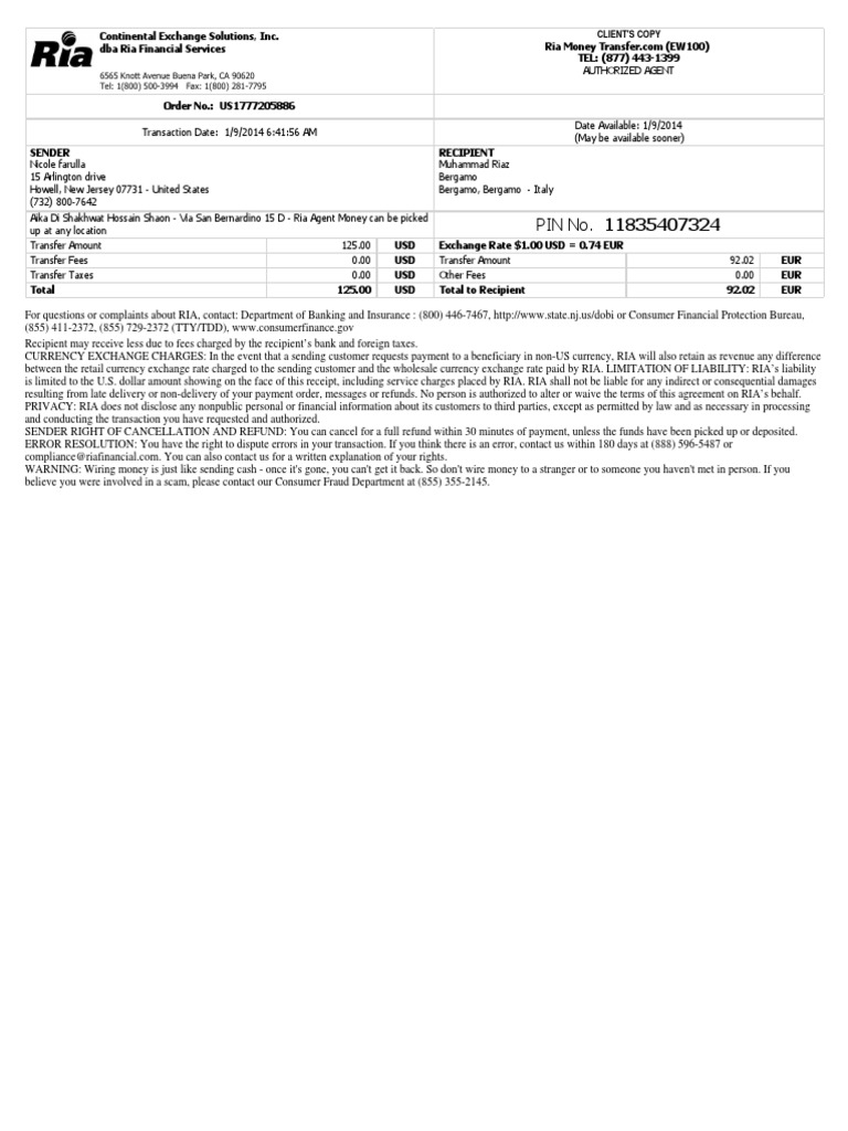 ria exchange rate