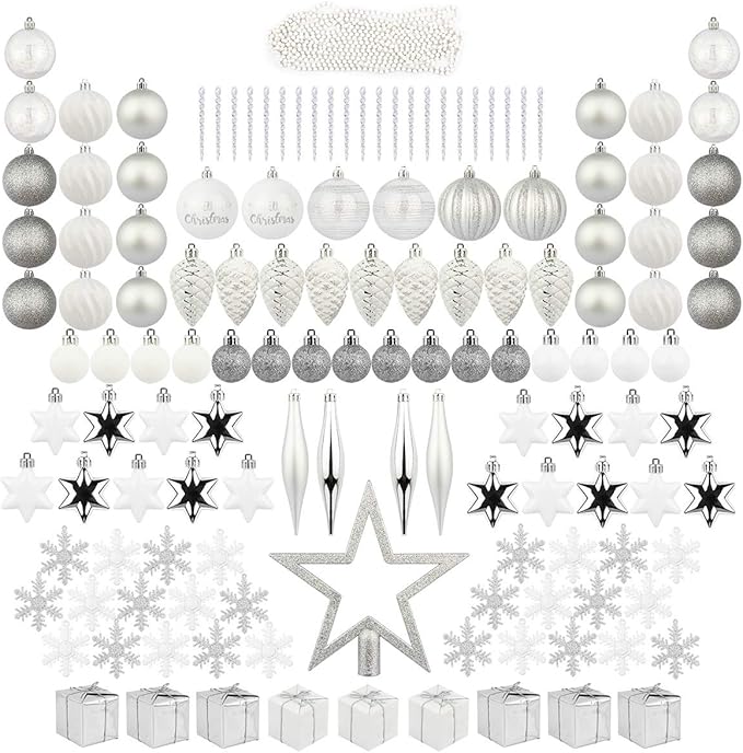 silver and white christmas tree decorations