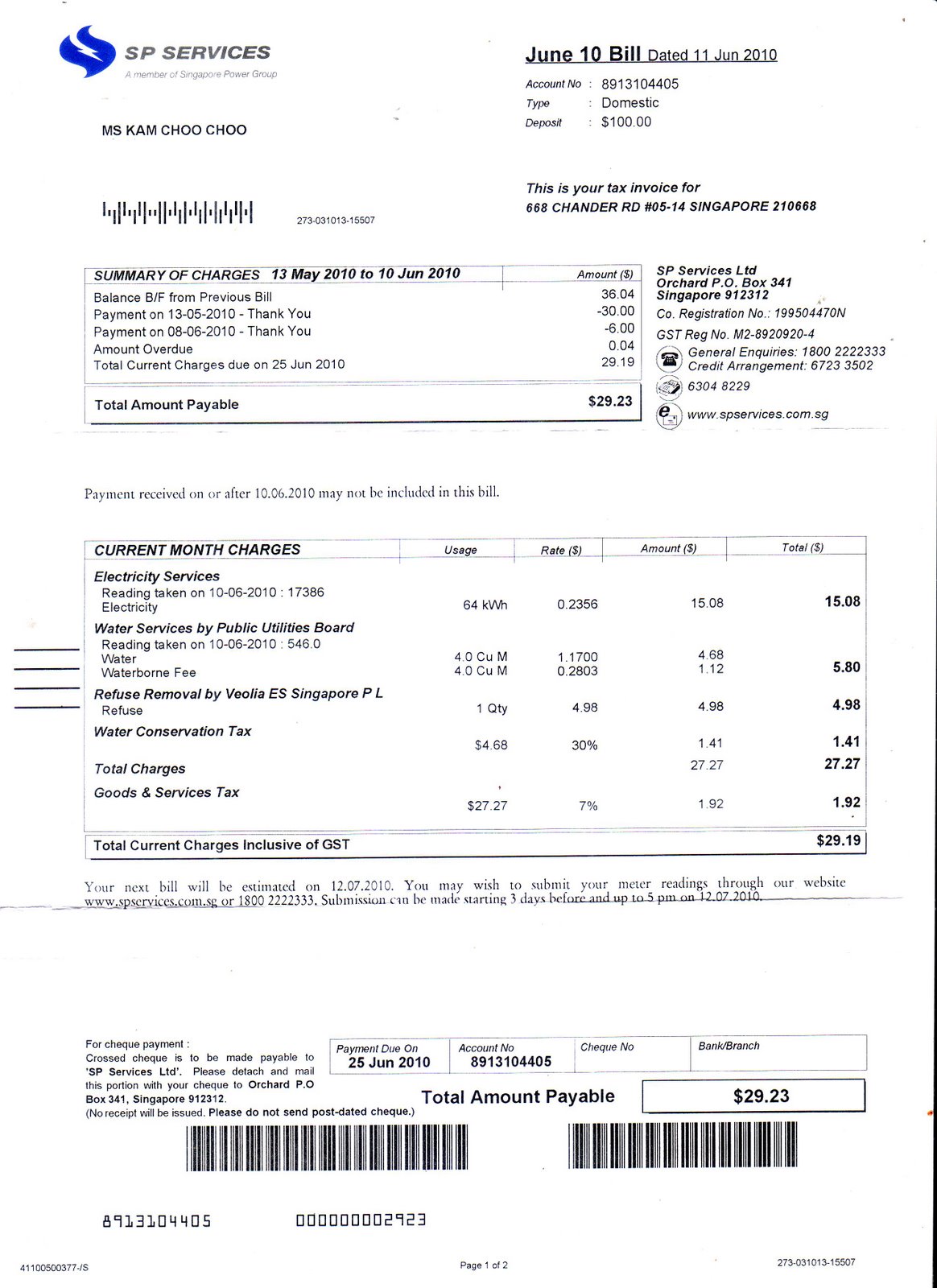 water and electricity bill