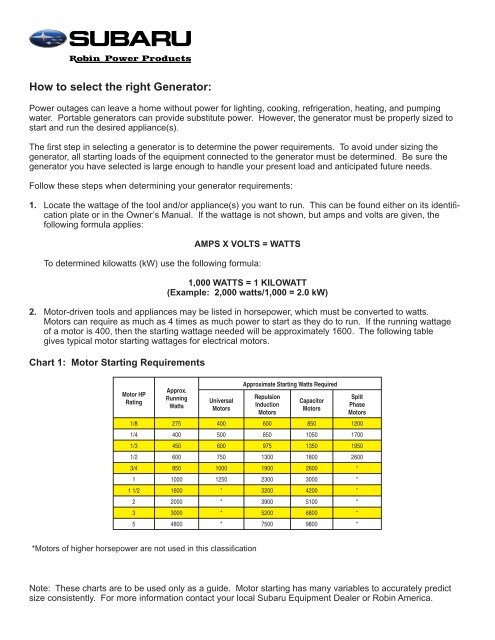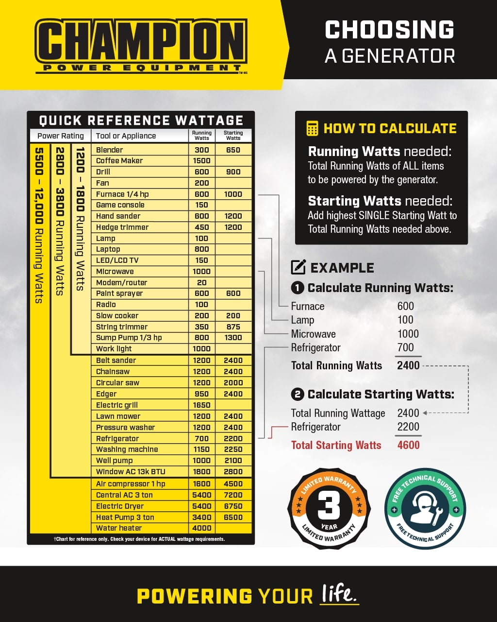 wattage chart for generator