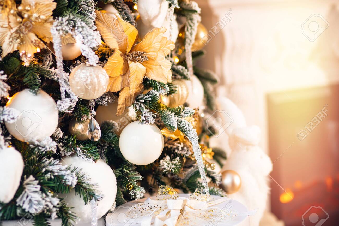 white and gold decorated christmas trees