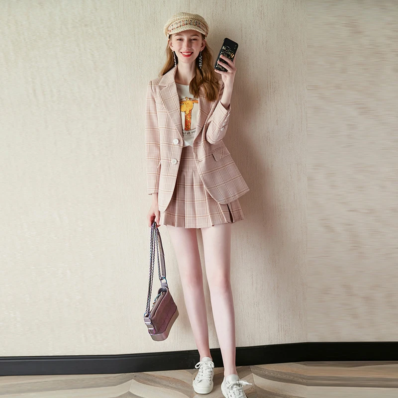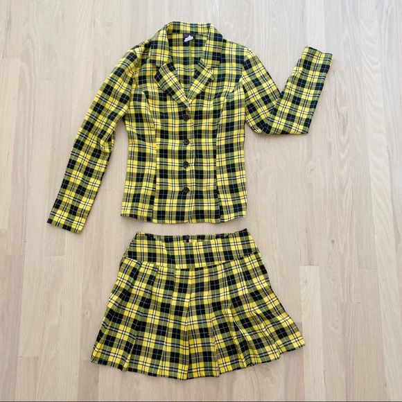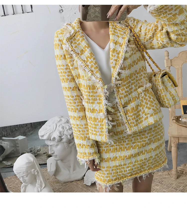 yellow plaid blazer and skirt